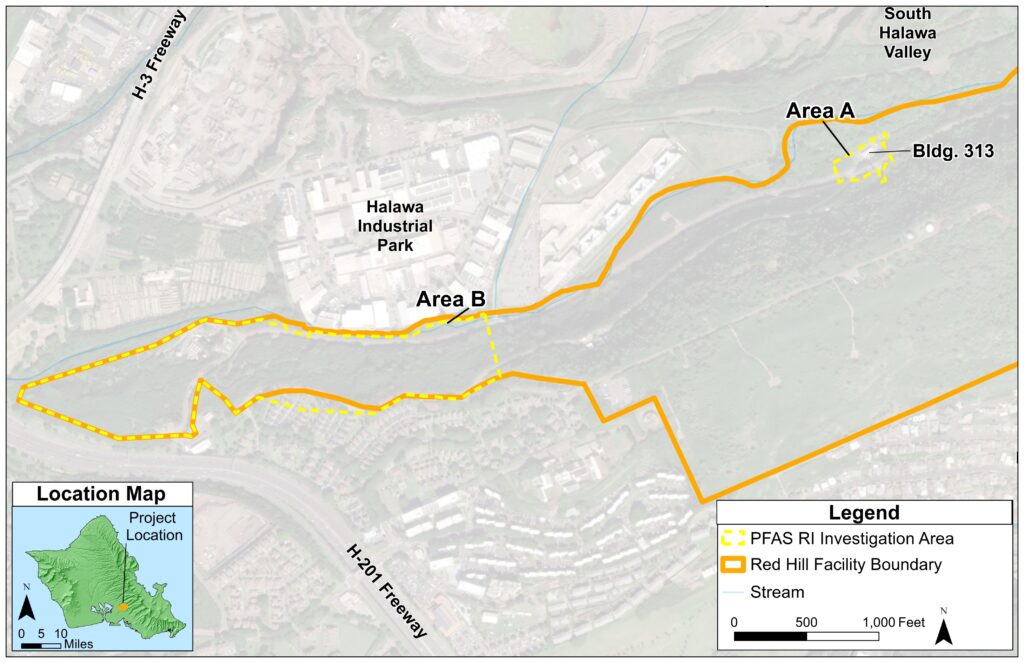 A Remedial Investigation (RI) is being conducted to evaluate per- and polyfluoroalkyl substances (PFAS) associated with known and potential undocumented aqueous film-forming foam (AFFF) release areas located at the Red Hill Bulk Fuel Storage Facility (RHBFSF). The purpose of the RI is to evaluate the nature and extent of potential PFAS impacts, and to characterize potential risks to human health and the environment associated with exposure to PFAS. The investigation is focused near Building (Bldg.) 313, including the areas outside and adjacent to the Adit 6 entrance where a release of AFFF occurred in November of 2022 during maintenance of the AFFF storage and pumping system for the Facility, as well as near the Red Hill Shaft (RHS) Water Pump House and at the western extent of the RHBFSF within the former Oily Waste Disposal Facility (OWDF).